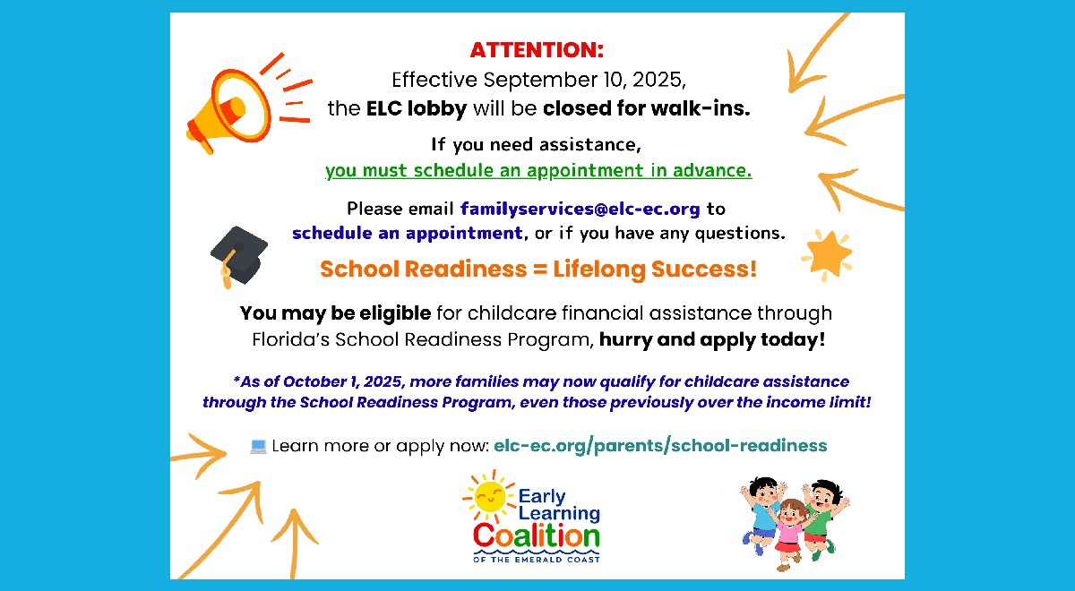 The Early Learning Coalition provides for the coordination, integration, efficiency, and quality of early childhood services in Okaloosa and Walton Counties.
