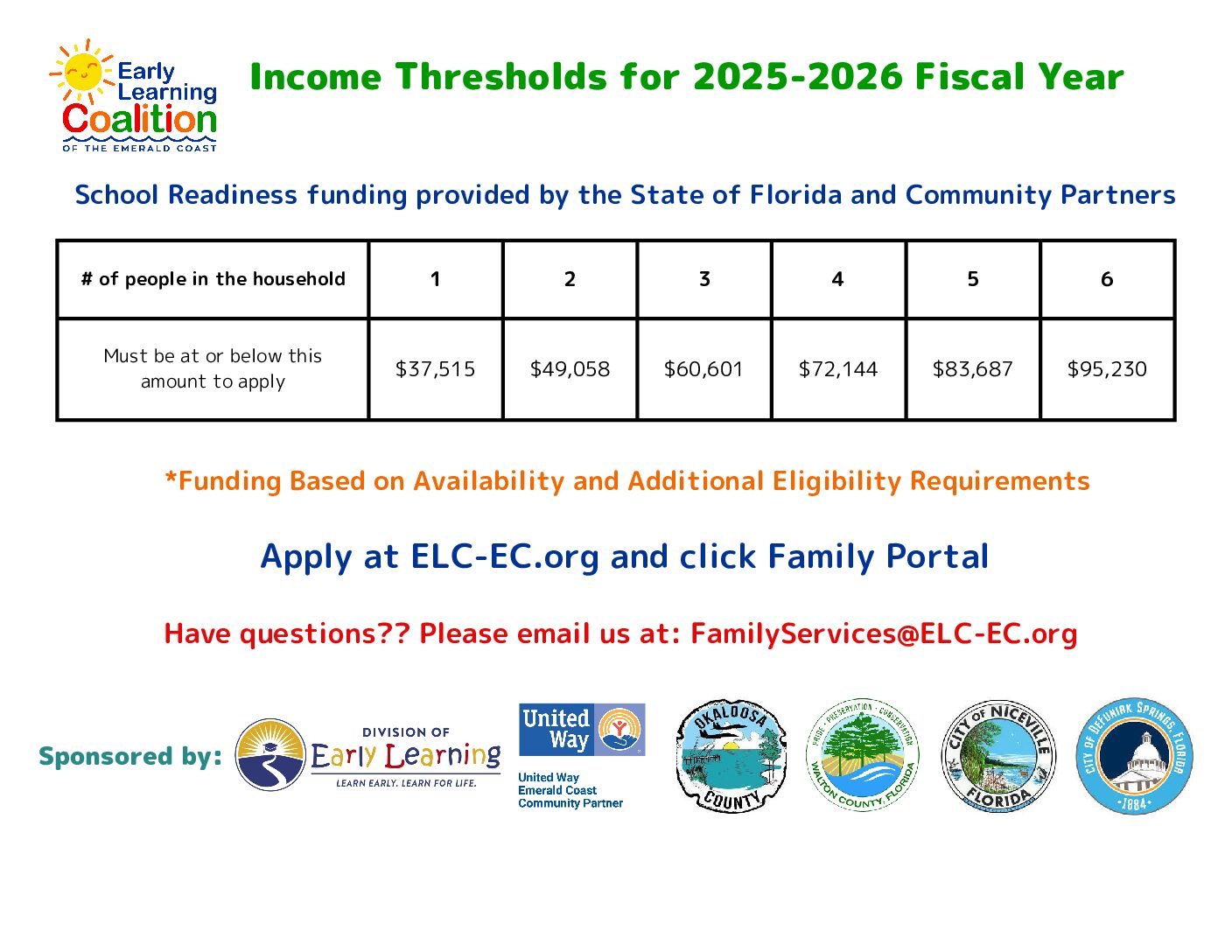 Funding from the Early Learning Coalition of the Emerald Coast, offers financial assistance to eligible families so that they can obtain affordable, quality childcare for children ages birth through 12 years. Eligibility requirements are based on total family income with adults within the family employed or engaged in eligible work or education activity for at least 20 hours per week. To begin receiving School Readiness funding assistance, combined earnings, including all sources of income, may be at or below 55% of the State Median Income (SMI). Families may also be referred for childcare funding assistance by appropriate community agencies.